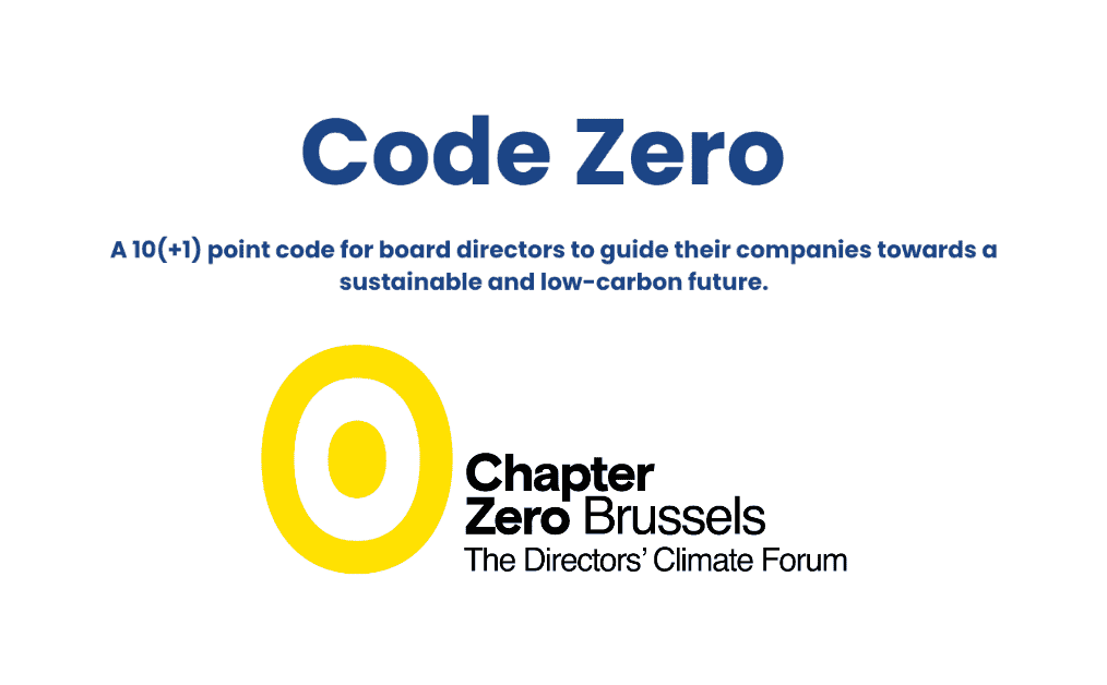 From Chapter Zero Brussels Chapter Zero Brussels have developed Code Zero – a 10(+1) point code for board directors to guide their companies towards a sustainable and low-carbon future. Download the guide here: https://www.chapterzerobrussels.eu/_files/ugd/827f18_754f7989a2994ca3b5e37b450db041d3.pdf